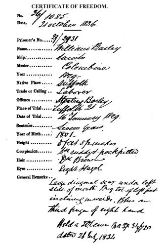 On 21 October 1836 William Barley was given his Certificate of Freedom; he had served 7 years and 9 months.
