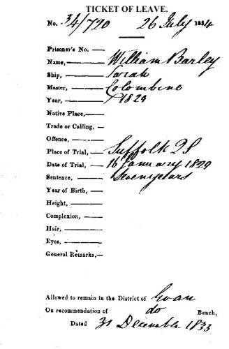 On 21 October 1836 William Barley was given his Certificate of Freedom; he had served 7 years and 9 months.
